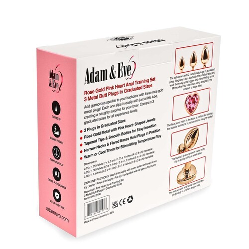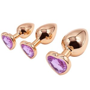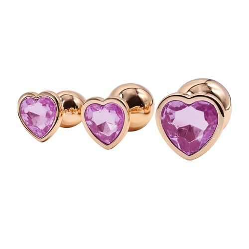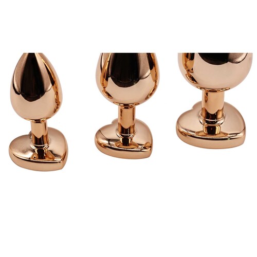 Sexy aluminum plugs in 3 sizes let you train from beginner to anal expert! Show off with glamorous rose gold finishes and heart-shaped jewel bases.