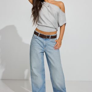 Asymmetric Cinched Waist Sweater Gray women – Getting ready is a cinch. Features Asymmetric off-the-shoulder construction Short cap sleeves Cinched rib knit waist Size & Fit Fit: Relaxed Length: Cropped Model is wearing size S Materials & Care Content: 70% viscose, 30% nylon Care: Machine wash, cold Imported
