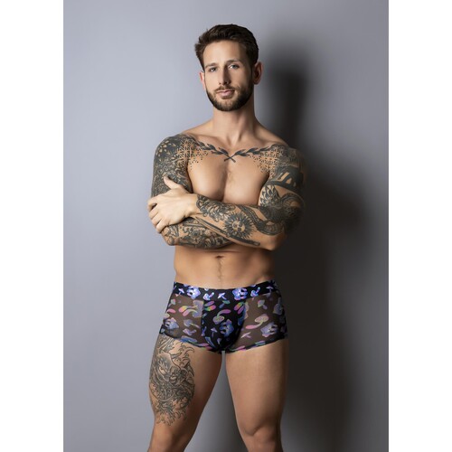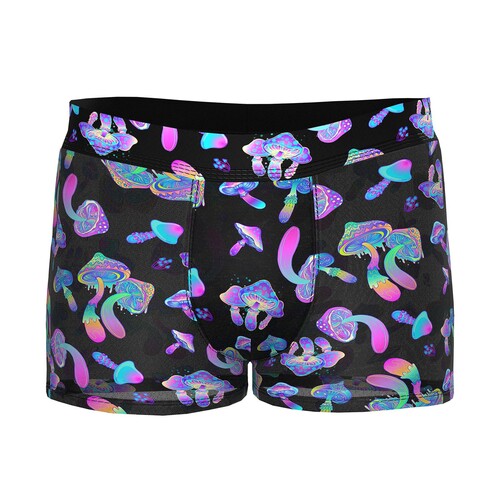 Take a glowing trip on the wild side in these sexy men’s shorts with supportive pouch and glows-under-blacklight magic mushroom print. Discreet shipping.