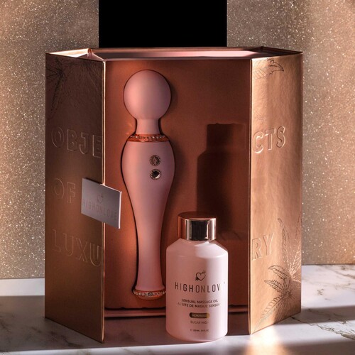 Indulge your every desire with this luxuriously ohh-gasmic set! Includes deluxe bedazzled silicone massager plus hemp seed massage oil. Great gift!