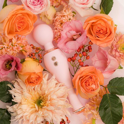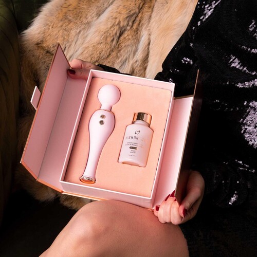 Indulge your every desire with this luxuriously ohh-gasmic set! Includes deluxe bedazzled silicone massager plus hemp seed massage oil. Great gift!