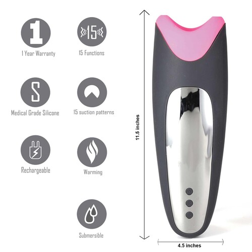 Feel the thrill of triple the stimulation with this rechargeable luxury masturbator that surrounds your shaft with vibration, suction & warmth. Free gifts.