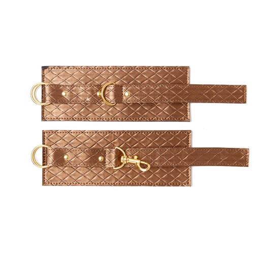 Longing for love? Wrap these dramatic bronze cuffs around your wrists and submit to seduction. Buckle closure. D-rings for play with other toys.